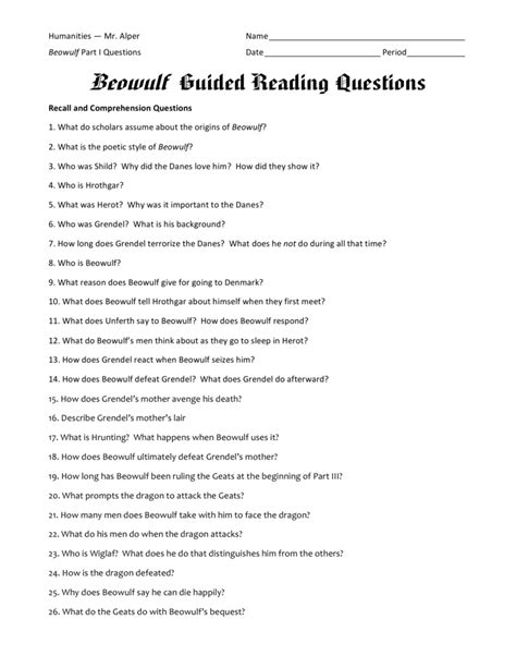 Beowulf Guided Reading Questions Answer Key. What feats has beowulf already accomplished [when he is introduced]? Web beowulf is is god's tool who makes sure it happens.