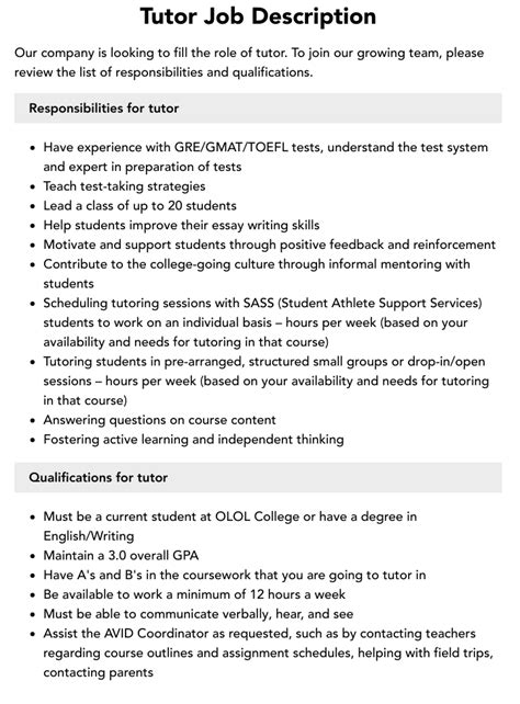 Reading Tutor Job Description. Tutor assists children, aged kindergarten through sixth grade in the development of reading skills and enjoyment. Web a tutor, or private instructor, is responsible for providing students with individualized assistance to help them learn new concepts and complete assignments.