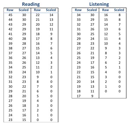 TOEFL Listening and Reading raw and scaled score
